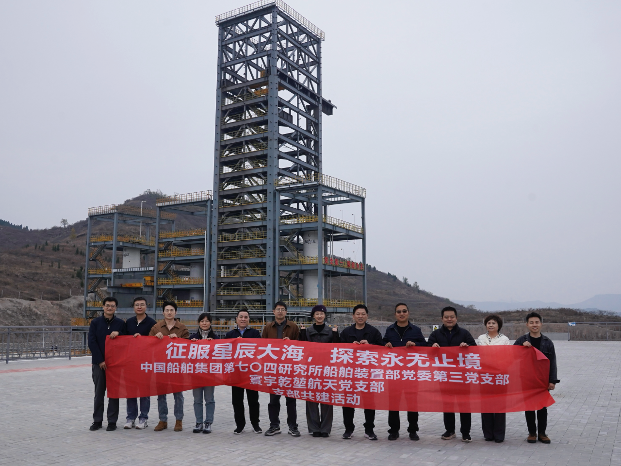當日下午,大家走進山東乾堃液體火箭動力系統試驗基地,通過宣傳片與展廳全面了解平臺建設歷程與技術突破,隨后共同攀登111級"火箭步道"觀景平臺。這級臺階既寓意"一飛沖天,直沖九霄寰宇",更象征著寰宇乾堃"三個唯一"的硬核實力,雙方黨員登高遠眺,合影定格下攜手逐夢航天的奮進時刻。